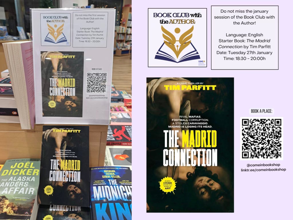 To anyone in and around Barcelona, come along if you can to this ‘Book Club with Author’ event at the Come In English Bookshop on Tuesday 27 January at 6.30pm. You don’t need to have bought your copy of ‘The Madrid Connection’ from the shop - in fact you don’t need to have bought it from anywhere! We’re simply going to have fun chatting about it, and it would be great to see you there. The shop says it would be best to register via the QR code or via this link.