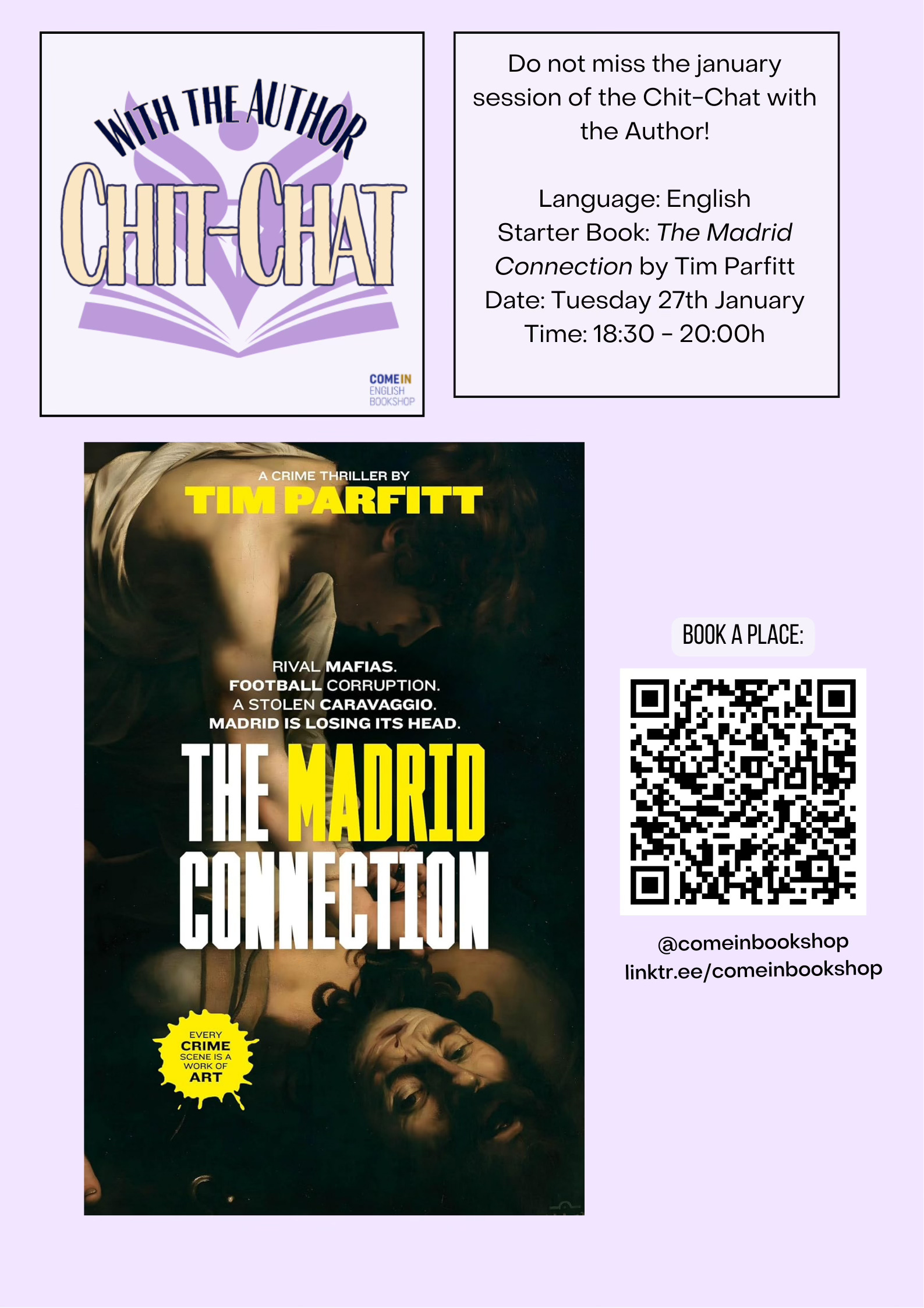 To anyone in and around Barcelona, come along if you can to this ‘Chit-chat with Author’ event at the Come In English Bookshop on Tuesday 27 January (tomorrow!) at 6.30pm. You don’t need to have bought your copy of ‘The Madrid Connection’ from the shop - in fact you don’t need to have bought it from anywhere! We’re simply going to have fun chatting about it, and it would be great to see you there. The shop says it would be best to register via the QR code or via this link.