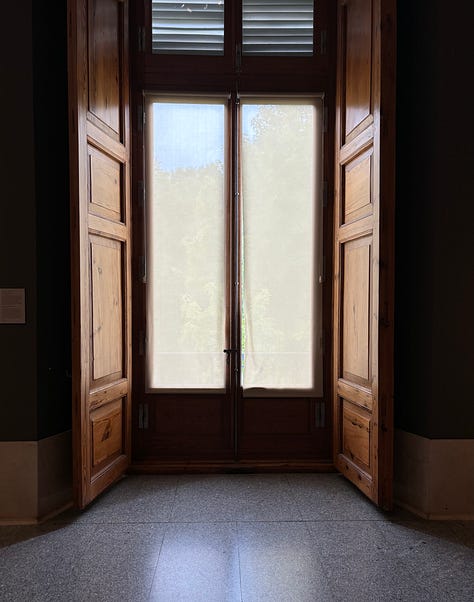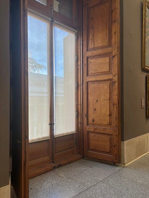 In the adjacent Rooms 2 - 6, there are five sets of double French window doors, four of which overlook a courtyard just one floor below - the ground floor - where there’s an outdoor Café Prado alongside the main entrance to the museum (more on this Café Prado in future posts). Every time I went to Rooms 2 - 6, the wooden shutters on the French windows were open, and there was only one steel bar that could be fixed to the base of each set of doors, yet leaving the glass windows without any bars across them.
