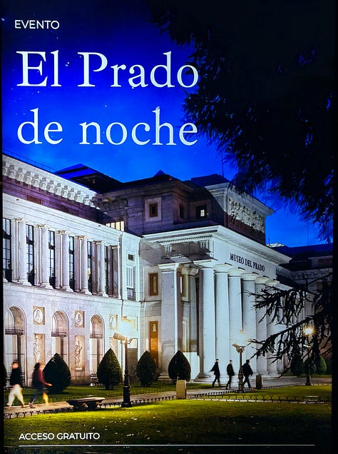 The Prologue of The Madrid Connection starts with a ‘Prado by Night’ event. These are normally public events and free. I think during 2025 the museum opened its doors for free on the first Saturday of most months, from 8.30pm to 11.30pm. In my novel, however, it is a private event for patrons, sponsors, suppliers and ‘friends of the museum’.