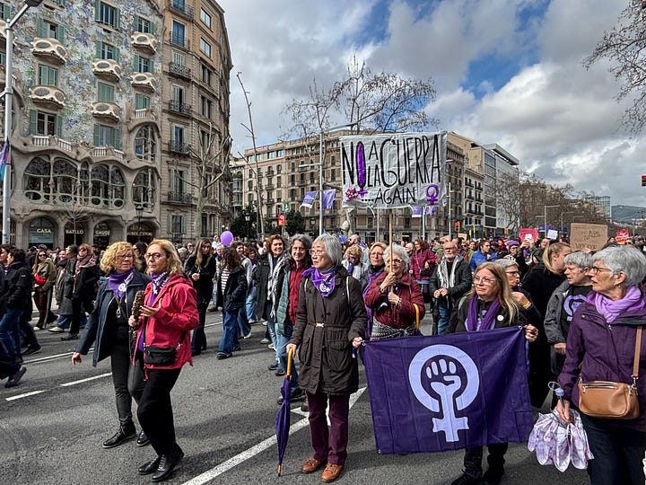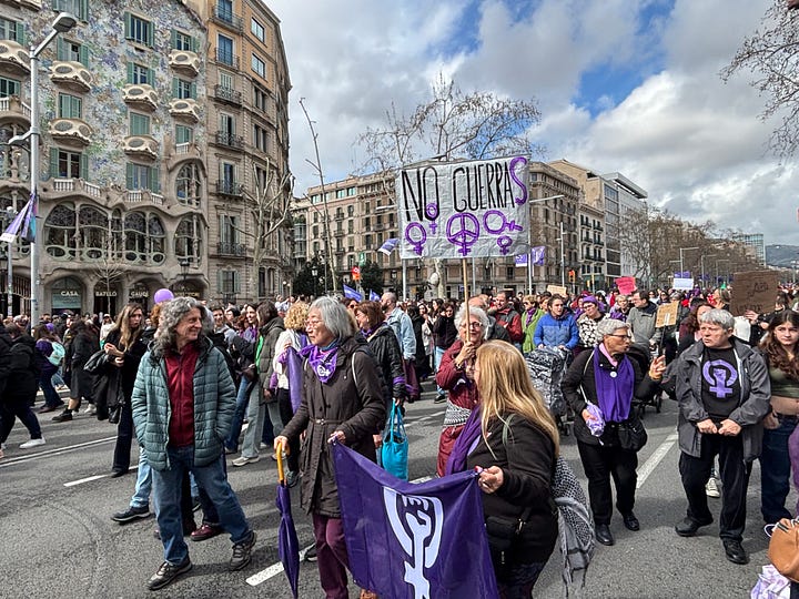 I had brunch with two of my sons in Barcelona yesterday. Then we stumbled upon an International Women’s Day rally making its way down Passeig de Gràcia. We stopped and watched.