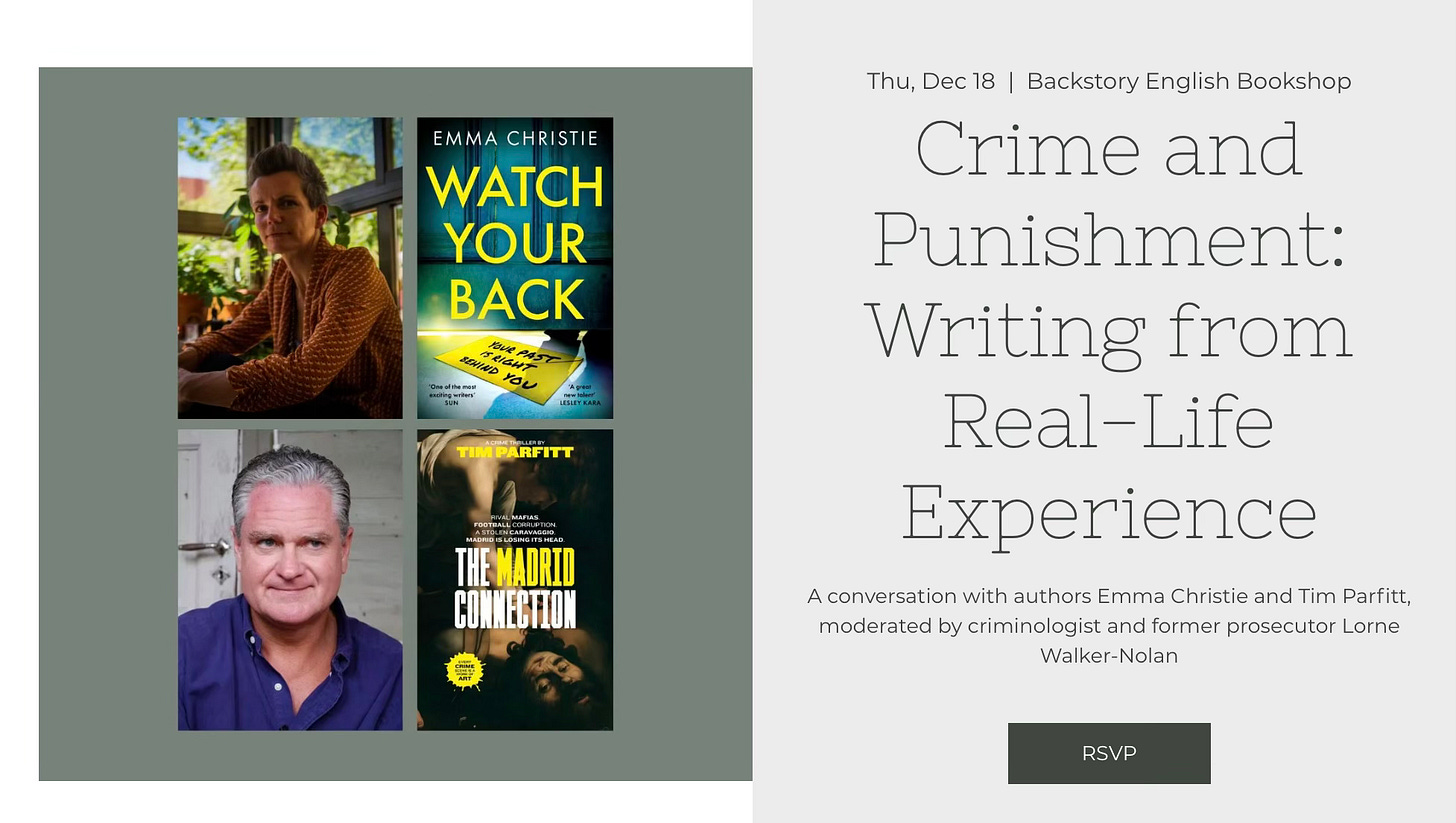 On Thursday 18 December I am participating in an event in Barcelona at the Backstory English Bookshop, Carrer de Mallorca, 330 - from 6pm to 7.30pm. It’s called ‘Crime and Punishment: Writing from Real-Life Experiences’. I’ll be chatting alongside Scottish author and former crime journalist Emma Christie and Lorne Walker-Nolan, professor of criminology and a former criminal lawyer. Click here for further details and to RSVP or on image below. Come along if you can - I hope to see you there!